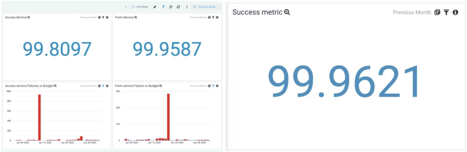 99.99%という最終目標はまだ遠いので、より小さな目標を定め、赤、黄、緑のしきい値を定義して、反復的な目標の達成状況を示すようにしました。グリーンに到達したら、次の目標を設定しました。.