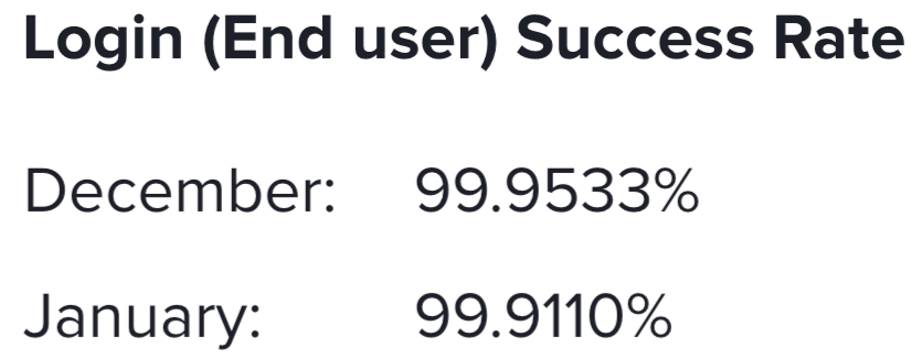詳細:これは、エンドユーザーのログイン成功を含む、重要な信頼性指標です。これには、OneLogin UX、サポートされているプロトコル、またはAPIを介しているかどうかにかかわらず、OneLoginへのアクセス、OneLoginへの認証、またはOneLoginを介したアプリへの認証やアクセスを試みるエンドユーザーに代わり、OneLoginに対するすべてのリクエストが含まれます。